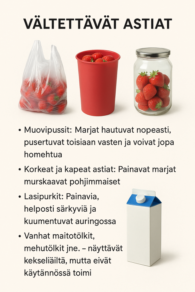 Mansikka on herkkä marja. Se litistyy helposti, erityisesti lämpimällä säällä tai jos marjat painuvat toisiaan vasten. Vääränlainen astia voi siis pilata suuren osan saaliista, ennen kuin pääset edes kotiin.